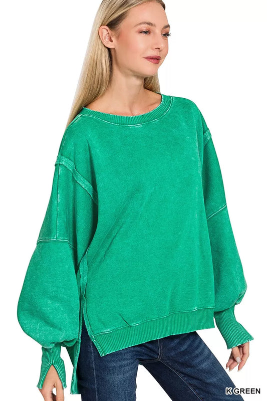 Zenana Acid Washed Batwing Sleeve Fleece Sweatshirt