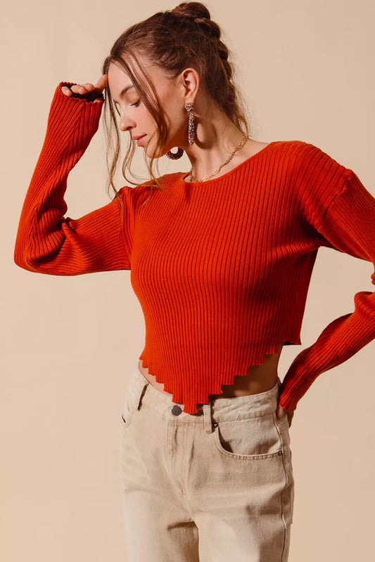 Rib‑Knitted Shaped Hem Cropped Sweater